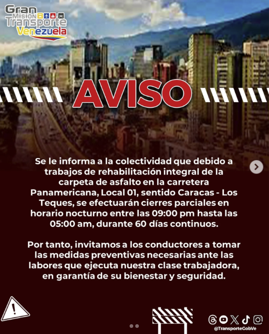 12-05-25.-La carretera Panamericana tendrá cierres parciales en sentido Caracas-Los Teques a partir de este lunes 12 de mayo en un horario comprendido entre las 9:00 p. m. y las 5:00 a. m. durante dos meses, así lo informó el Ministerio del Transporte en sus redes sociales.