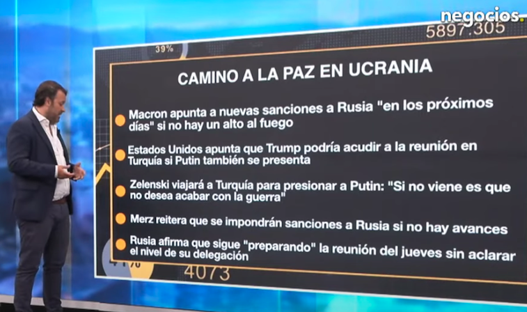 Europa empieza a plantear que son inmediatas las sanciones. Comienza a hablar de que va a haber un decimo séptimo paquete de sanciones. Europa se va a lanzar en la Cumbre de Turquía para lanzar pecho, las sanciones serán sobre la energía. El camino a la paz vemos que Europa empieza a plantear que las sanciones van a ser casi imposibles de poner. Macron apunta a nuevas sanciones a Rusia "en los próximos días" si no hay un alto al fuego. Estados Unidos apunta que Trump podría acudir a la reunión en Turquía si Putin también se presenta. Zelensky, a su vez, viajará a Turquía para presionar a Putin: "Si no viene es que no desea acabar con la guerra". Merz reitera que se impondrán sanciones a Rusia si no hay avances. También vemos que Rusia afirma que sigue "preparando" la reunión del jueves sin aclarar el nivel de su delegación.