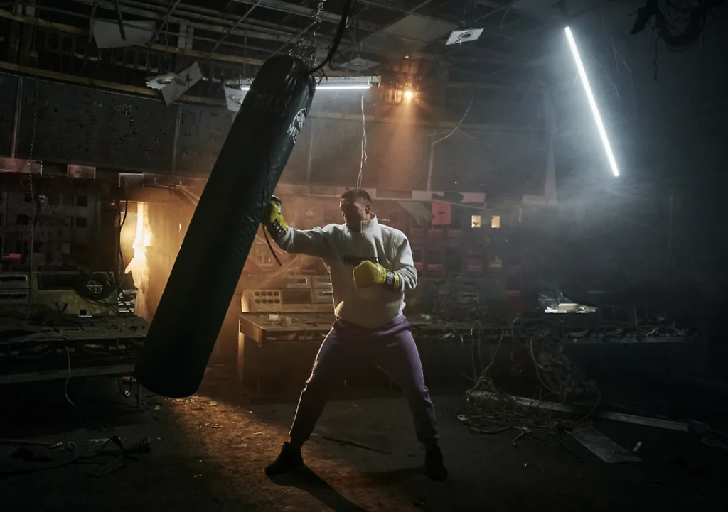 golpea un saco de boxeo en una planta de energía devastada en el centro de Ucrania para escuchar historias de supervivencia y resiliencia de los trabajadores de primera línea que mantienen la luz encendida en Ucrania el 17 de marzo.