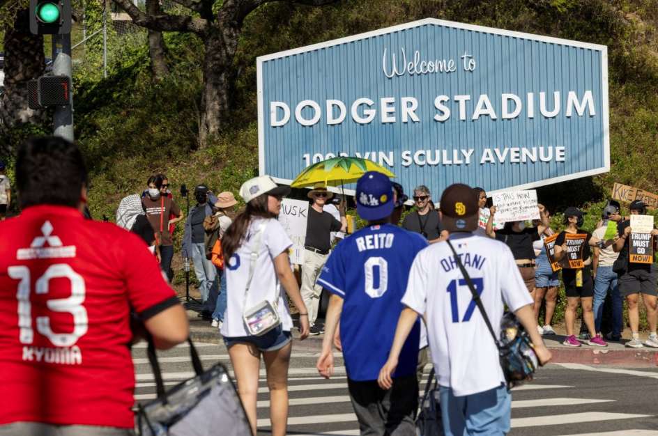 Otro periodista, Fabian Ardaya, quien cubre a los Dodgers para The Athletic, escribió: “Los agentes de inmigración intentaron acceder al Dodger Stadium esta mañana, pero los Dodgers les negaron el acceso. Esta mañana circularon imágenes de agentes que aparentemente usaban los estacionamientos como zona de espera”. Los manifestantes llegaron al Dodger Stadium poco después. La policía formó una fila frente a una de las entradas del estadio, informó LAist.