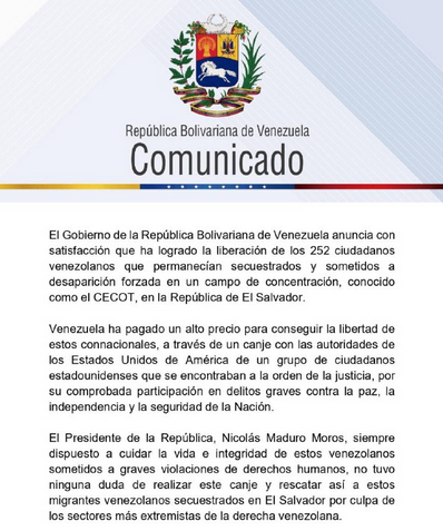 18 de julio de 2025.- El Gobierno de la República Bolivariana de Venezuela anuncia con satisfacción que ha logrado la liberación de los 252 ciudadanos venezolanos que permanecían secuestrados y sometidos a desaparición forzada en un campo de concentración, conocido como el CECOT, en la República de El Salvador.