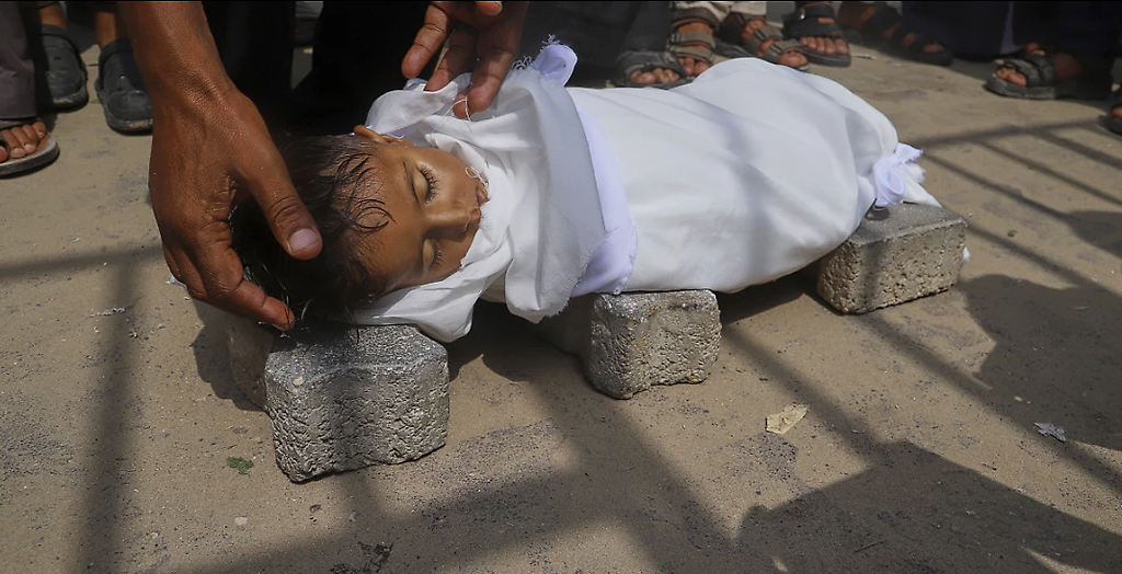 El cuerpo de Jamal al-Najjar, de 5 años, es depositado en el suelo sobre ladrillos antes de la oración fúnebre tras su fallecimiento en el Hospital Nasser de Khan Younis, al sur de la Franja de Gaza, el martes 12 de agosto de 2025. El jefe de la unidad de pediatría de Nasser informó que Jamal, quien nació con raquitismo, falleció por desnutrición severa.