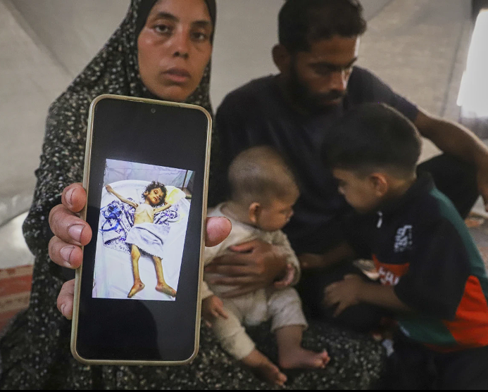Sentada junto a su esposo, Amin, y dos de sus hijos, Fatma Mashi muestra una foto en su celular del cuerpo de su hija de dos años y medio, Ro'a, quien, según los médicos, no tenía afecciones preexistentes y murió de desnutrición severa, en su tienda de campaña en Muwasi, al sur de la Franja de Gaza, el viernes 8 de agosto de 2025. Los expertos dicen que no es inusual que un miembro de la familia esté peor que los demás.
