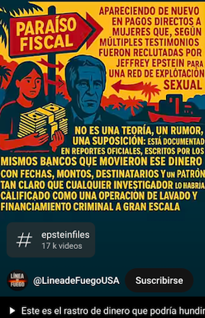 Domingo 17 de agosto de 2025. Denuncias sobre manejos dudosos de grandes cantidades de dinero, alrededor de 1,500 millones de dólares de una de las cuentas de Epstein están bajo investigación pues se sospecha que fueron utilizadas para que las mujeres envueltas en la red de comercio sexual, manejada por el extinto financiero, permanezcan en silencio.
