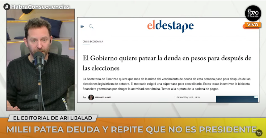 Lunes, 18 de agosto de 2025. En este editorial Ari Lijalad examina el tratamiento que el presidente Milei le esta dando la deuda argentina, recomendado para aquellos aporreadores y aporreadoras interesados en la evolución de los acontecimientos en la vida financiera y social de la hermana república.