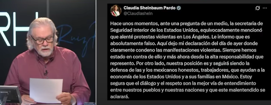 Martes, 19 de agosto de 2025. La presidenta Claudia Sheinbaum desmintió las acusaciones hechas por la secretaria de Seguridad Nacional de EU, Kristi Noem, quien la señaló de “fomentar protestas violentas” en Los Ángeles. “Es totalmente falso”, dijo Sheinbaum.