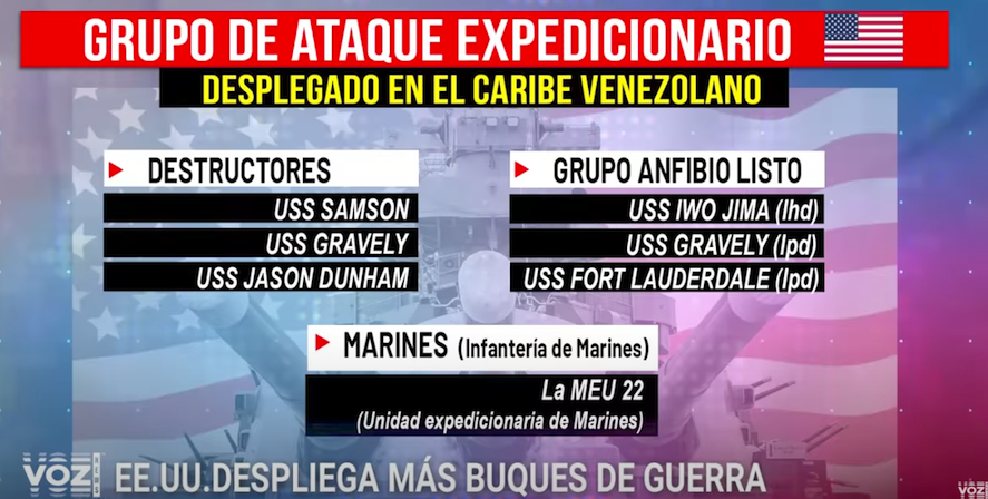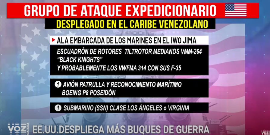 Viernes, 22 de agosto de 2025. Estados Unidos despliega más buques militares frente a las costas de Venezuela, ha ordenado el despliegue de numerosos buques de guerra y personal militar cerca de las costas de Venezuela señaló Karolina Yapor, conductora de las noticias, se trata de tres buques anfibios que se unen a varios destructores que ya habían sido enviados en las últimas horas.