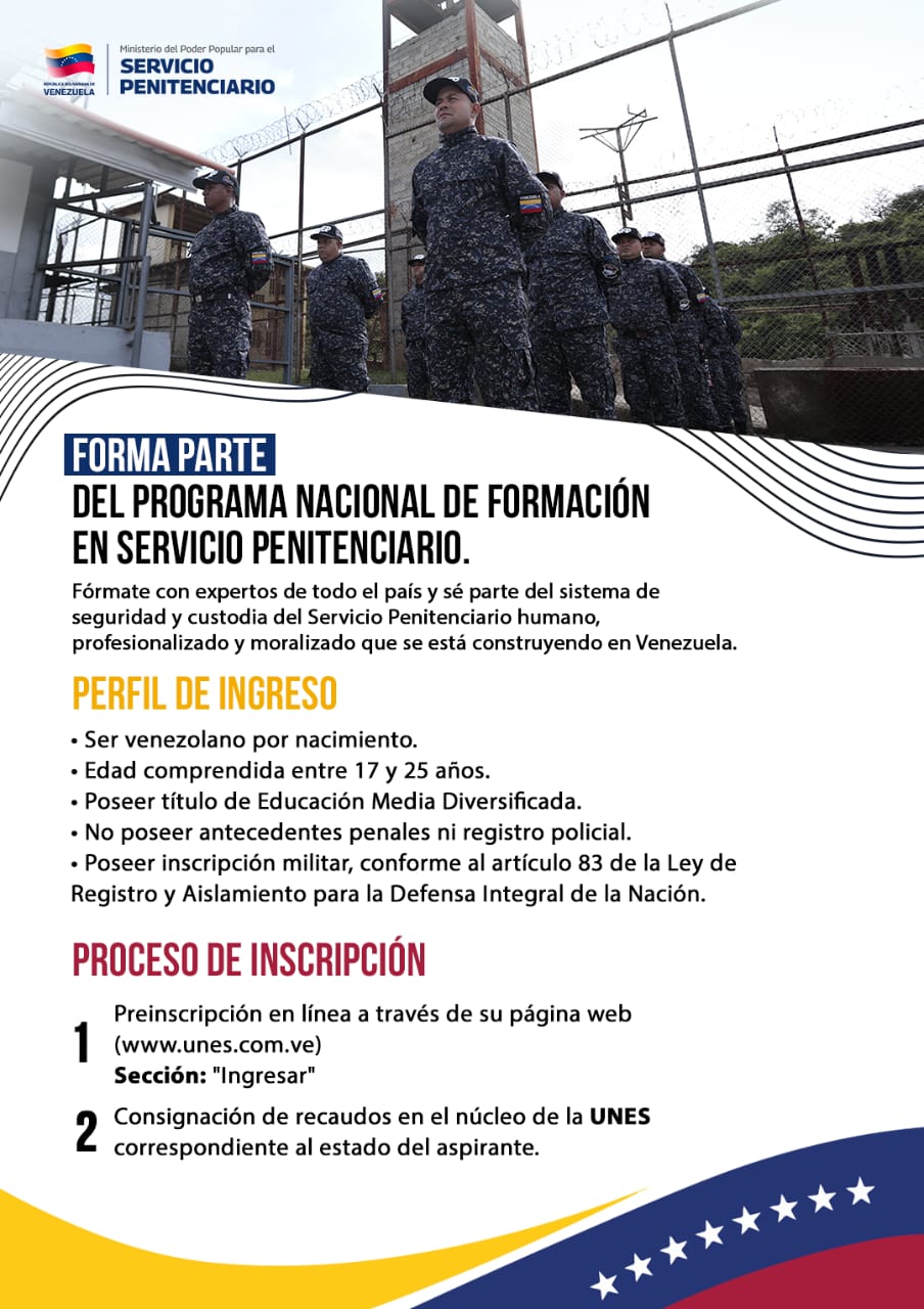 2 de septiembre de 2025.-Este martes, la Universidad Nacional Experimental para la Seguridad (UNES), en alianza con el Ministerio del Poder Popular para el Servicio Penitenciario (Mppsp), dio a conocer el inicio de las inscripciones para el Programa Nacional de Formación (PNF) en Servicio Penitenciario, informó Prensa Mpprijp.