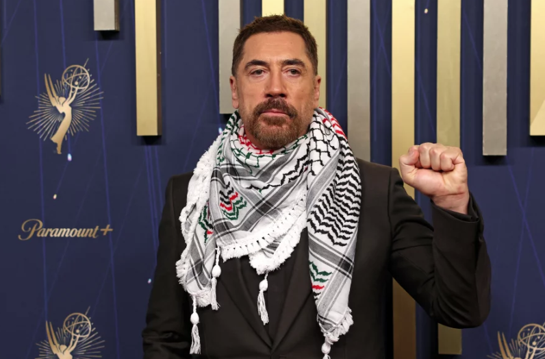 En la alfombra roja de los Premios Emmy del domingo, el actor Javier Bardem lució una keffiyeh, un pañuelo palestino blanco y negro.