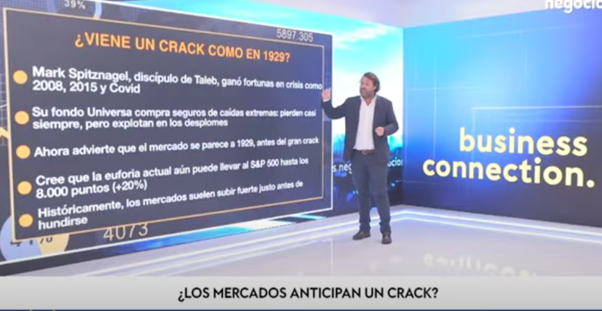El gestor de fondos Mark Spitznagel, discípulo de Nassim Taleb y experto en anticiparse a grandes crisis financieras, ha lanzado una seria advertencia: podríamos estar encaminándonos hacia un nuevo crack similar al de 1929, pero en pleno siglo XXI. En un informe publicado por su firma Universa, asegura que el mercado muestra todos los síntomas de una burbuja a punto de estallar, con valoraciones excesivas, una confianza ciega en la política monetaria de los bancos centrales y una exposición récord por parte de inversores institucionales y particulares. Aunque el S&P 500 podría subir hasta los 8.000 puntos en una última ola de euforia, Spitznagel afirma que prefiere renunciar a esas ganancias para posicionarse de forma defensiva ante lo que prevé como un desplome histórico.