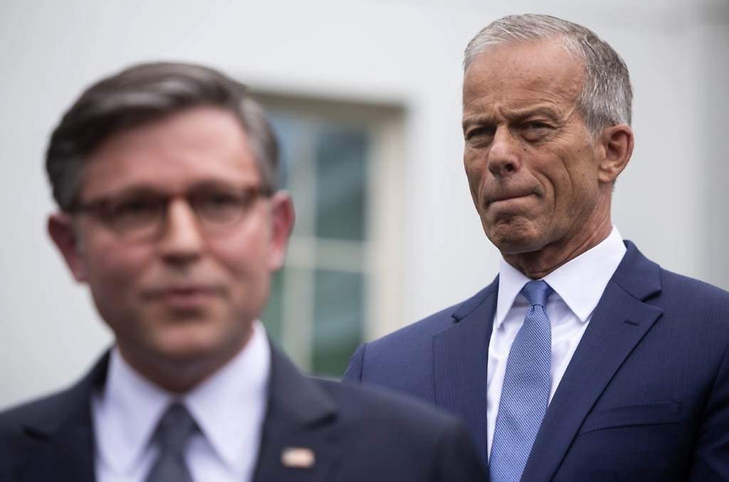 El presidente de la Cámara de Representantes, Mike Johnson, y el líder de la mayoría del Senado, John Thune, hablan con la prensa en la Casa Blanca el 29 de septiembre de 2025. |