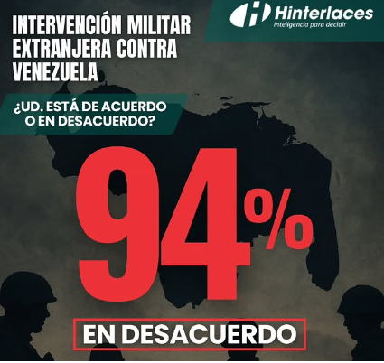 9 de octubre de 2025.- El más reciente estudio de opinión realizado por la encuestadora Hinterlaces revela que el 94% de los venezolanos está en desacuerdo con una intervención militar extranjera contra Venezuela, mientras que solo un 4% se manifiesta a favor.