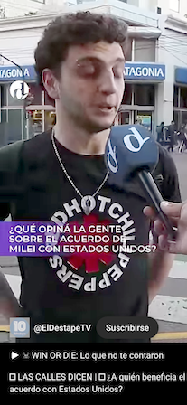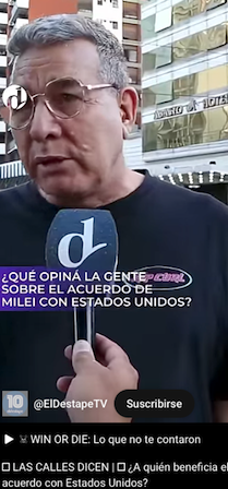 Viernes, 17 de octubre de 2025.- El Destape TV realizó una encuesta en las calles de Buenos Aires sobre lo que piensa la gente de el acuerdo de Milei con Esrados Unidos y el resultado fue un rechazo, casi toral en los ciudadanos argentinos consultados.