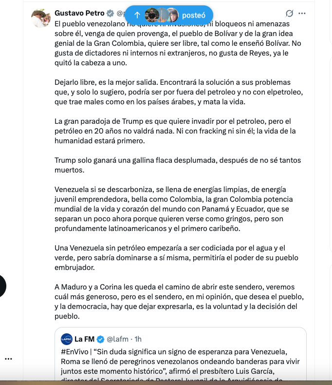 Con este mensaje, Petro reafirma su postura regionalista y su apuesta por una salida democrática, soberana y ecológica para Venezuela.