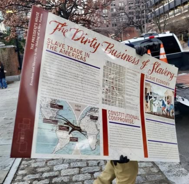 En la demanda, los abogados de la ciudad escribieron: «Sin previo aviso a la Ciudad de Filadelfia, el Servicio de Parques Nacionales retiró obras de arte y exposiciones informativas de la Casa Presidencial que hacían referencia a la esclavitud, presumiblemente en cumplimiento del mandato de la Orden Ejecutiva».