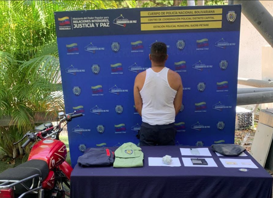Durante el procedimiento se le incautó un envoltorio de presunto "cripy" con un peso de 57,70 gramos, una balanza digital, un teléfono celular, una motocicleta color rojo, un bolso negro y un uniforme de la Policía Municipal de Caracas, que era utilizado por el sujeto para intentar burlar los distintos puntos de control desplegados en el Área Metropolitana de Caracas.