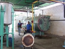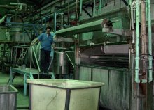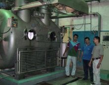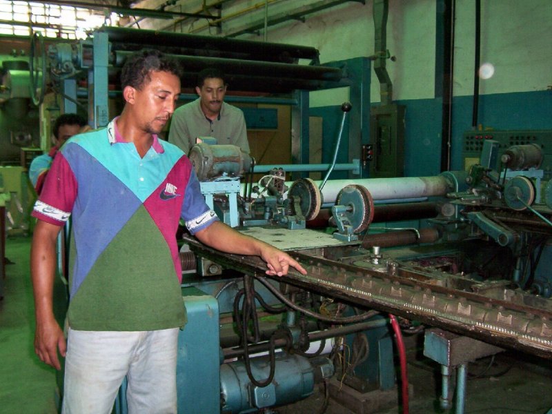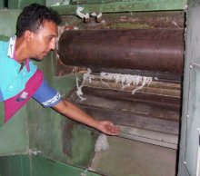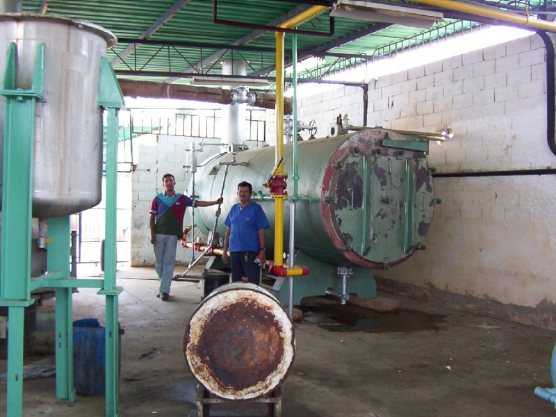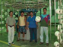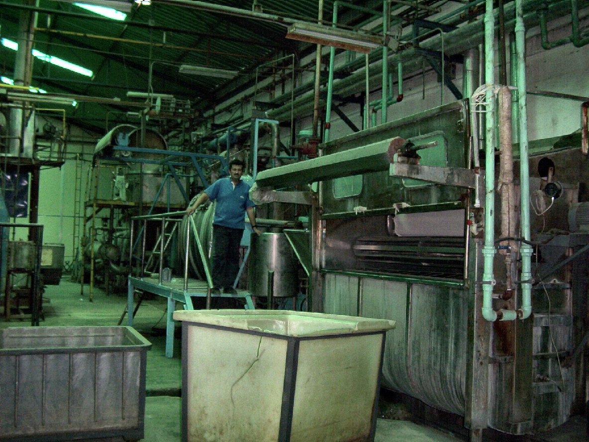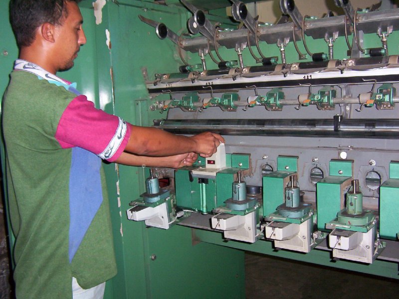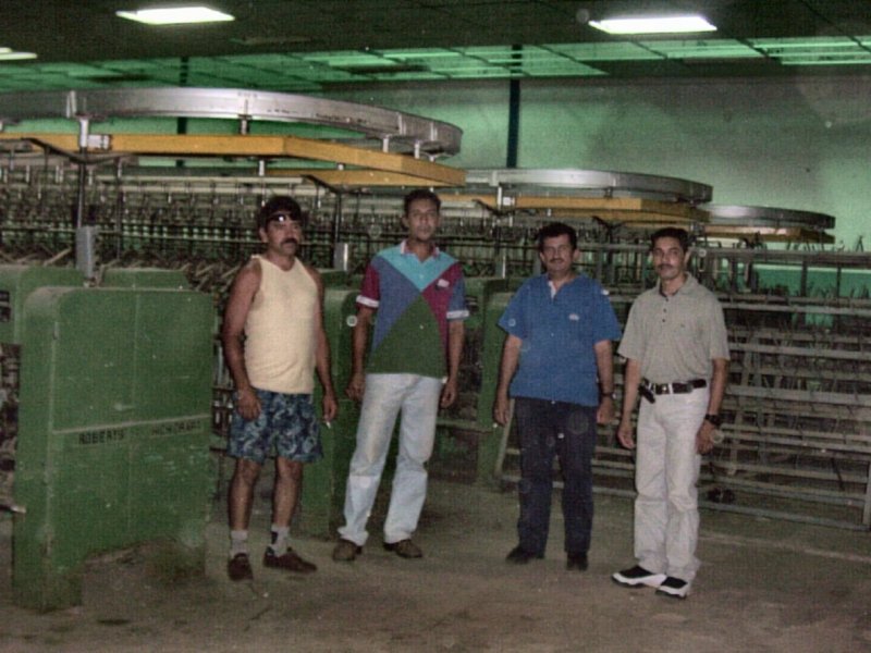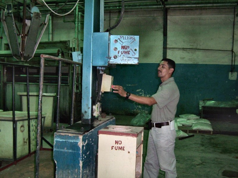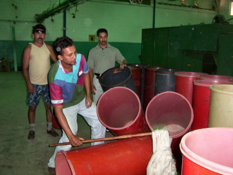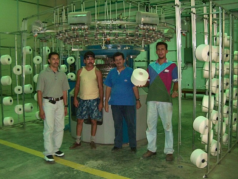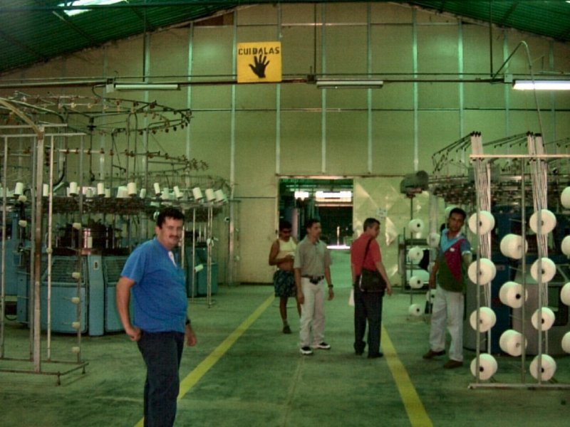 | Obreros frente a la teñidora "La Caramba" de fabricación española. La temperatura generada por ésta y otras máquinas, es muy alta. Los supervisores disfrutan de oficinas con aire acondicionado. |