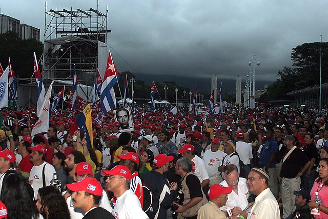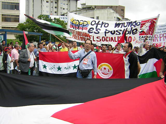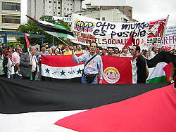 A la cabeza de la marcha, una larga tela blanca intentaba condensar en una frase la polifonía de voces que viene a expresarse en la tierra natal del Libertador Simón Bolívar: “No a la guerra y al imperialismo. Otro mundo es posible, otra América es posible”.