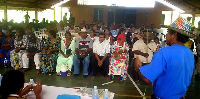 Foto leyenda: Ante la acostumbrada ausencia de las autoridades ambientales y los representantes de la corporación regional de carbón Corpozulia, campesinos, indígenas y habitantes cercanos a la ruta del carbón fueron exponiendo el modo al que han sido obligados a vivir al margen de la explotación. Desplazados de sus tierras, conviviendo con el polvillo toxico, viendo el desmoronamiento progresivo de sus casas cercanas a las carreteras (guillotinas de asfalto) hechas solo para el paso de las gandolas y no de la gente.