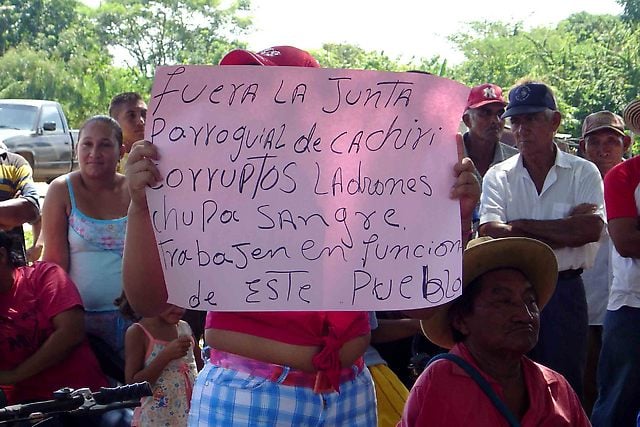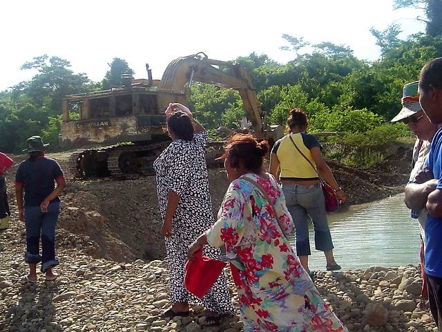 Graciela Gonzáles (campesina de la zona): Yo lo que tengo en Cachirí son 7 años y considero que nosotros no debemos diferenciar y menos apedrear al que lucha por la comunidad. El compañero que apedrearon (Mervin) esta luchando por el beneficio de la comunidad, yo no soy de este sector (Los Cachos) pero también soy del Cachirí y uso el río. Allí tienen una pancarta que dice que ONICA tiene 15 anos beneficiando a la comunidad, y yo me pregunto dónde esta ese beneficio. Si tienen hoy 30 empleos los emplearon ayer porque allí nunca hubo más de diez trabajando. Ayer arrancó la máquina a raspar el camino pa’ decir que esta ayudando, entonces para que uno diga ahora ONICA si va a hacer por la comunidad. Eso son puros cuentos de caminos. Porque si ONICA tiene 15 años que diga la gente dónde está el beneficio. Siempre ha sido un grupito el que se beneficia, pero no la comunidad, y si usted dice (refiriéndose al alcalde) que levanten la mano quien esta en contra le aseguro que hay más porque beneficiados aquí no hay. Y es ese grupito que corrió a la casa de Javier (dirigente campesino opositor a ONICA) a quererle quemar la casa y golpear su familia yo pregunto con qué derecho, cuáles son los programas de viviendas que tenemos, qué carretera tiene asfaltada ONICA a esta comunidad, dónde están los colegios. Las maestras llegan a las 11 de la mañana al pueblo porque no hay transporte. Esta comunidad esta cansada, ese río no los están dañando, eso es una naturaleza que Dios nos dio, y el río se ha secado por esa empresa.