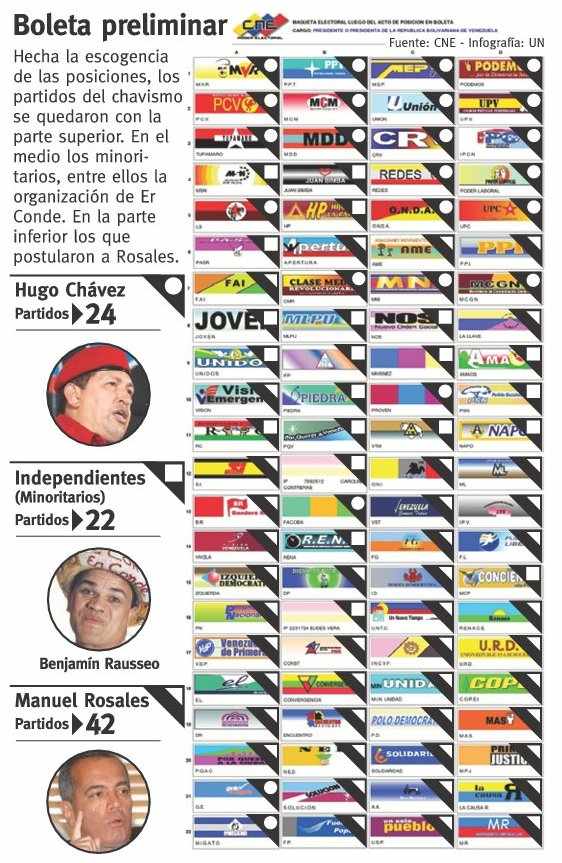 Caracas, - En un acto de la Junta Nacional Electoral, instalado por la presidenta del Poder Electoral, rectora Tibisay Lucena, las distintas organizaciones con fines políticos, grupos de electores o electoras, candidatos o candidatas por iniciativa propia, escogieron este lunes su ubicación en el instrumento de votación para las elecciones presidenciales del 3 de diciembre.