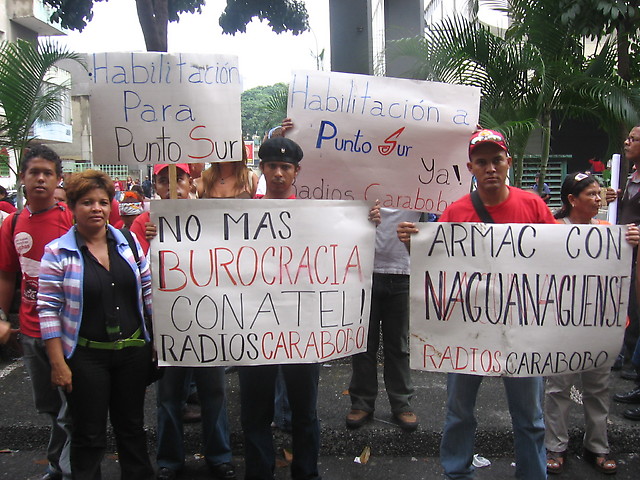 En la asamblea intervinieron muchos voceros de las radios comunitarias y explicaron los problemas técnicos y de financiamiento que están confrontando sin solución satisfactoria por parte de CONATEL, a la que señalan como reproductora del sistema capitalista de comunicaciones y la acusan de no actuar oportunamente frente a las amenazas mediáticas contra las libertades democráticas y el proceso revolucionario. En la concentración destacaban los cartelones de Radio Naguanagüense y Radio Punto Sur, entre otras que reclaman por los obstáculos interpuestos a su habilitación. Los comunicadores afirmaban que CONATEL no cumplía los compromisos contraídos en otras oportunidades y eso les obligaba a movilizarse.