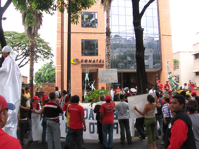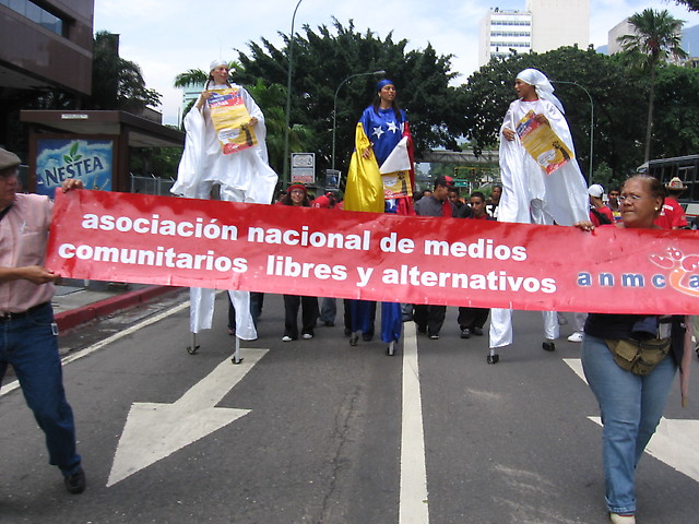 Varios centenares de comunicadores populares de los medios comunitarios y alternativos afiliados a la ANMCLA, marcharon ayer al medio día, desde la Plaza Brión de Chacaito hasta la sede de la Comisión Nacional de Telecomunicaciones (CONATEL) en Las Mercedes, Caracas.