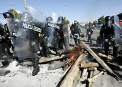 Oaxaca, Oax. Elementos de la Policía federal Preventiva (PFP) utiliza tanquetas antimotines para dispersar, con chorros de agua, a centenares de manifestantes que tratan de impedirles el paso hacia el Zócalo de esta ciudad.