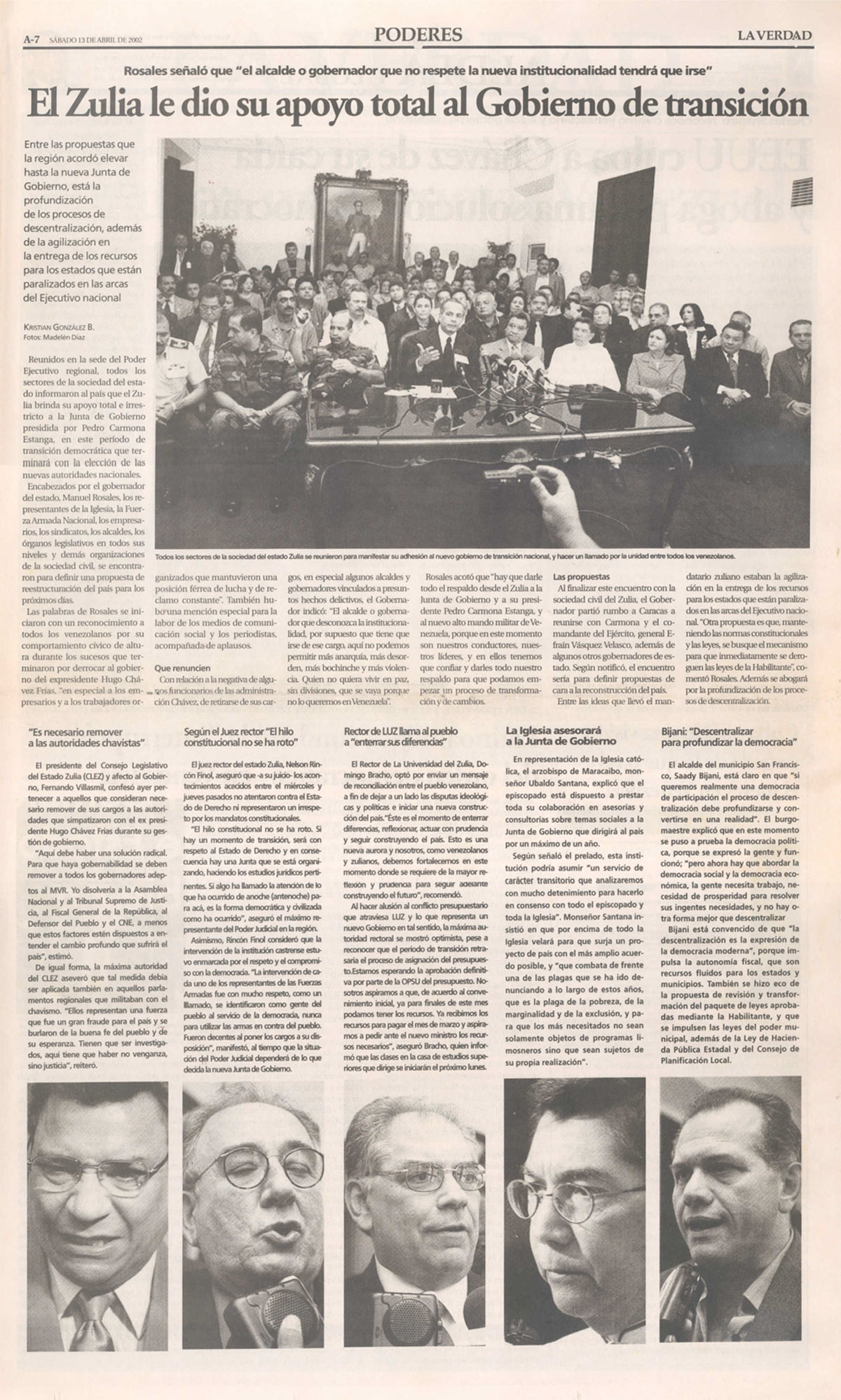 Las fotos y declaraciones de una rueda de prensa convocada por Manuel Rosales el día 13 de abril, a sólo horas del encuentro con Carmona y titulado: “El Zulia le dio apoyo total al gobierno de transición”, demuestra que el diario zuliano La Verdad, esta vez si la dijo.