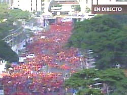 Caracas 26 nov. - Tal como lo denunciamos a través de Aporrea, los medios opositores, principalmente Globovisión, intentaron manipular a través de imagenes sezgadas la monumental concurrencia realizada por seguidores del presidente Chávez en las diferentes avenidas del centro de Caracas. La agencia británica Reuters reseña la multitudinaria concentración llevada cabo en Caracas haciendo mención donde los medios privados que transmitían segmentos menos concurridos de la manifestación.