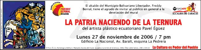 Este lunes 27 de noviembre a las a 7 de la noche el alcalde de Caracas, Freddy Bernal Rosales, develará el mural "La patria naciendo de la ternura", homenaje a Simón Bolívar y a Manuela Sáenz, en la avenida Baralt, esquina pedrera, edificio La Nacional.