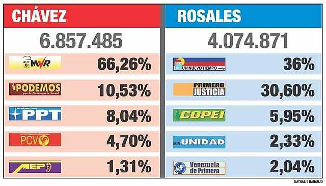 El partido que logró captar mayor porción del electorado, el MVR, logró 4.544.154 votos, seguido de Un Nuevo Tiempo que se acercó al millón y medio, mientras que Primero Justicia se quedó con 1.249.420 electores.