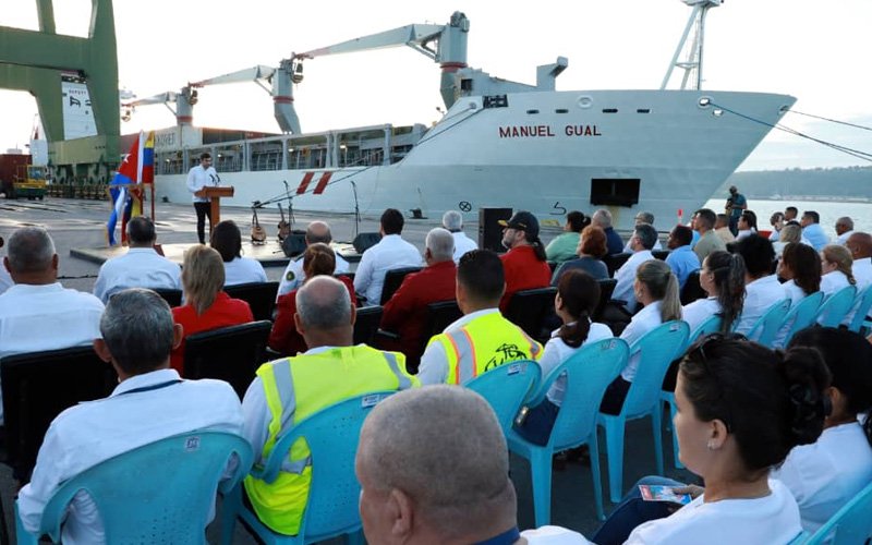 El buque “Manuel Gual” atracó en la terminal de contenedores de Mariel (situado a 45 kilómetros al oeste de La Habana), acorde con las imágenes publicadas en redes sociales por el jefe del Gobierno cubano, quien también asistió al acto de recibimiento de la carga.