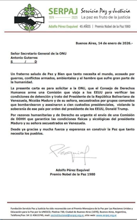 Viernes, 06 de febrero de 2026.- De la carta enviada por Pérez Esquivel a la ONU, fechada el día 14 de enero del presente año, no se sabe si ha obtenido respuesta.