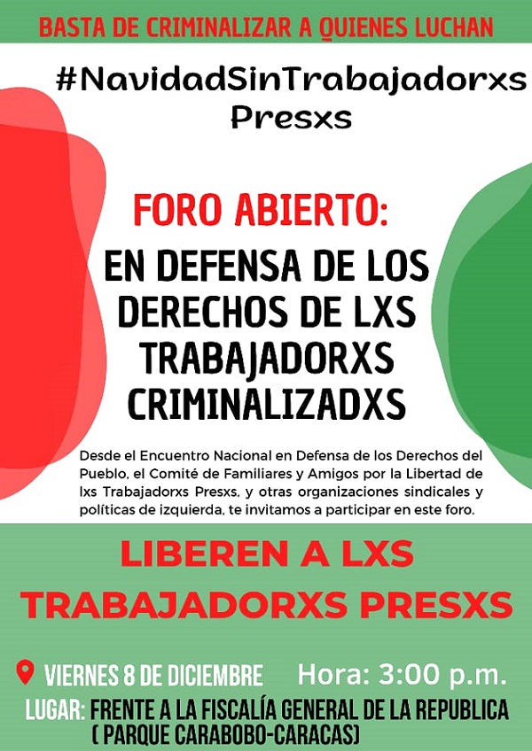 Organizaciones políticas que articulan en el espacio "Encuentro Nacional en Defensa de los Derechos del Pueblo", el Comité de Familiares y Amigos por la Libertad de las Trabajadores y Trabajadores presos, y otras organizaciones sindicales y políticas de izquierda, invitan a un foro abierto enmarcado en la campaña #NavidadSinTrabajadorxsPresxs.