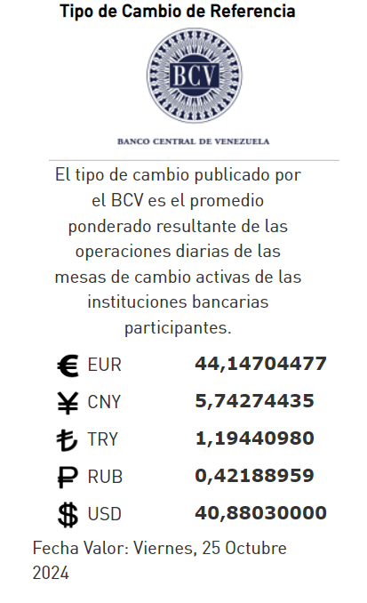 25-10-24.-El precio del dólar en el Banco Central de Venezuela (BCV) se cotizó este jueves 24 de octubre 2024 en Bs. 40,88 por unidad según la última actualización en su página web oficial y redes sociales.