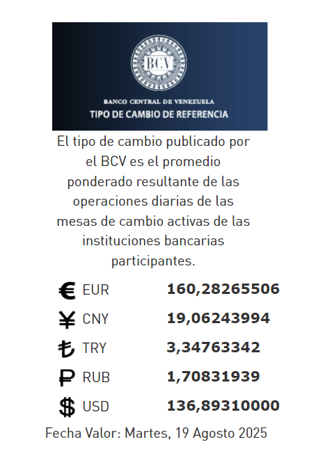 19-08-25.-El precio del dólar en el Banco Central de Venezuela (BCV) se cotizó este lunes 18 de agosto 2025 en Bs.136,89 por unidad según la última actualización en su página web oficial y redes sociales.