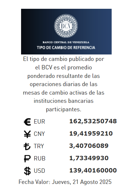 08-25.-El precio del dólar en el Banco Central de Venezuela (BCV) se cotizó este miércoles 20 de agosto 2025 en Bs.139,40 por unidad según la última actualización en su página web oficial y redes sociales.