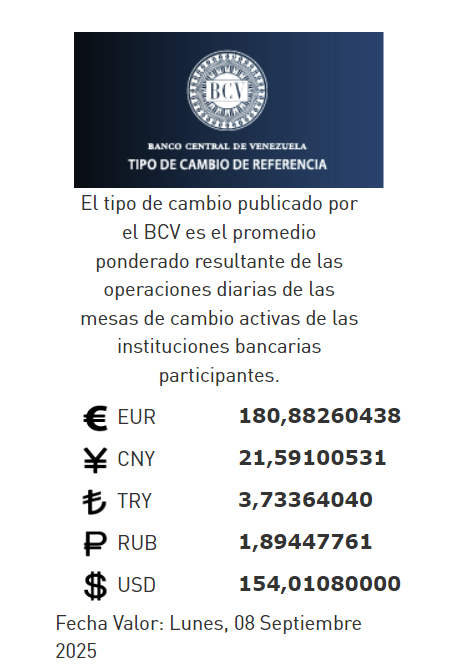 06-09-25.-El precio del dólar en el Banco Central de Venezuela (BCV) se cotizó este viernes 05 de septiembre 2025 en Bs.154,01 por unidad según la última actualización en su página web oficial y redes sociales.