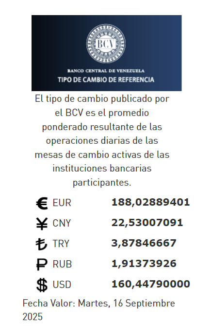 09-25.-El precio del dólar en el Banco Central de Venezuela (BCV) se cotizó este viernes 12 de septiembre 2025 en Bs.160,44 por unidad según la última actualización en su página web oficial y redes sociales.
