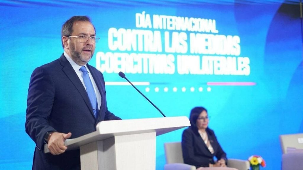 El canciller de Venezuela, Yván Gil, junto a la vicepresidenta Delcy Rodríguez, encabezaron este jueves un acto para conmemorar el Día Internacional contra las Medidas Coercitivas Unilaterales.