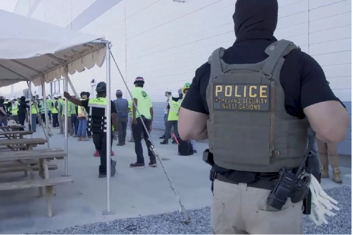 Un video publicado por el Servicio de Inmigración y Control de Aduanas (ICE, por us siglas en inglés) el sábado mostró una caravana de vehículos llegando al sitio y luego agentes federales dirigiendo a los trabajadores a alinearse afuera. A algunos detenidos se les ordenó poner las manos contra un autobús cuando eran cacheados y luego esposados en manos, tobillos y cintura.