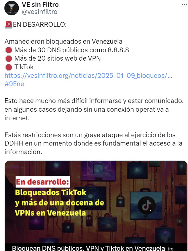 Cuando se desarrollan manifestaciones simultaneas del oficialismo y la oposición venezolana, la ONG Ve Sin Filtro indicó que los bloqueos a sitios web y redes sociales, que ocurren desde el 7 de enero se intensificaron la madrugada de este jueves 9 de enero tras la restricción a más de 30 sitios públicos de consulta, una veintena de VPN y de nuevo la red social TikTok.