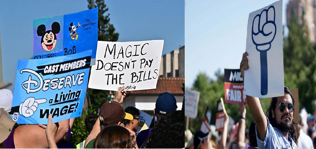 El miércoles pasado los trabajadores hicieron una manifestación frente a la entrada principal de Disneyland Resort en Anaheim, California, con carteles que exigían un salario que permita hacer frente a la inflación y denunciando que "La Magia no paga las facturas".