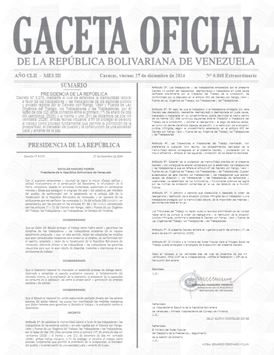 En Gaceta Oficial Extraordinaria Nº 6.868, de fecha viernes 27 de diciembre de 2024, fue publicada la prórroga del régimen de inamovilidad laboral para trabajadores públicos y privados.