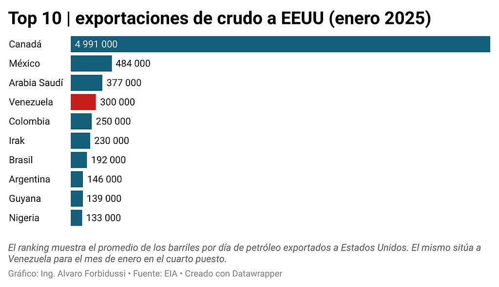 Por otro lado, la cifra alcanzada en enero de 2025 es un 89% superior a la lograda en el mismo mes de 2024, cuando el país vendió una media de 159.000 bpd a EEUU.