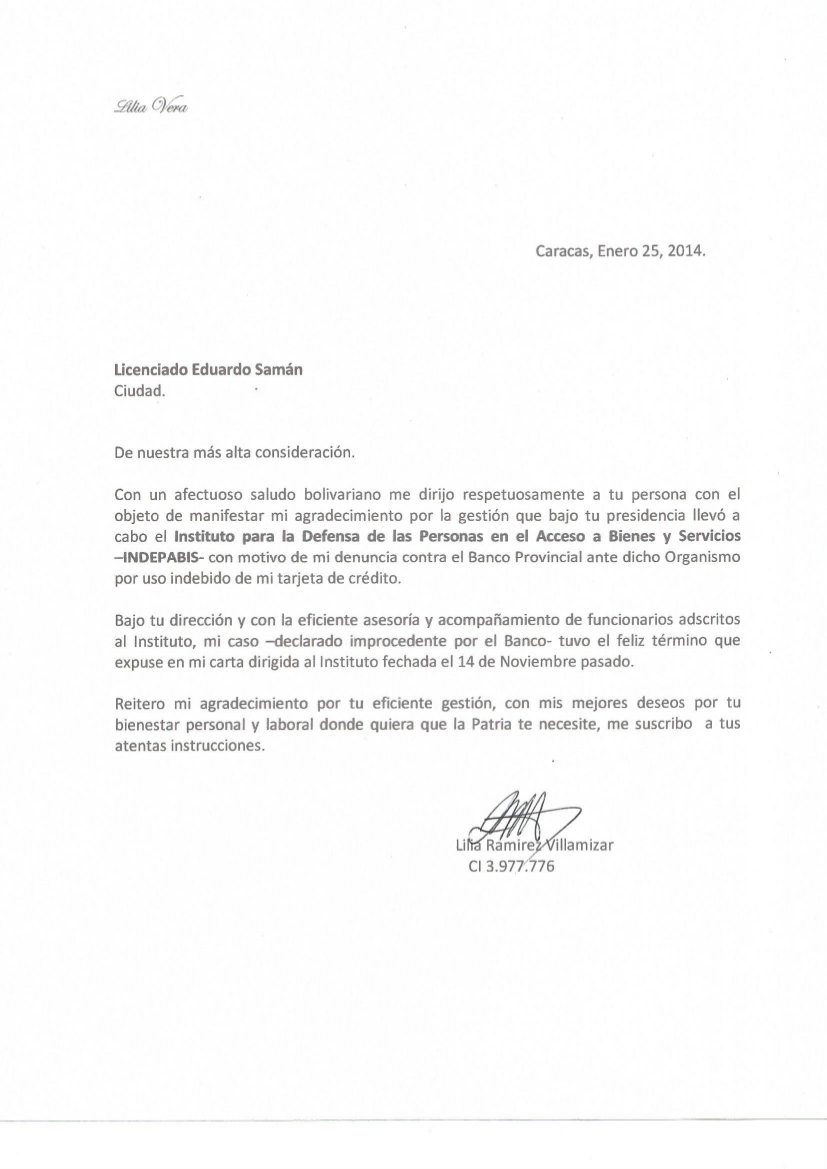 Nuestra querida desde siempre cantora popular Lilia Vera reconoce el trabajo realizado por el camarada Eduardo Samán y su equipo a través de una misiva dirigida al mismo, una vez que acudió a la institución Indepabis, donde fue atendida y resuelto su problema con total satisfación. A continuación contenido de la carta:
