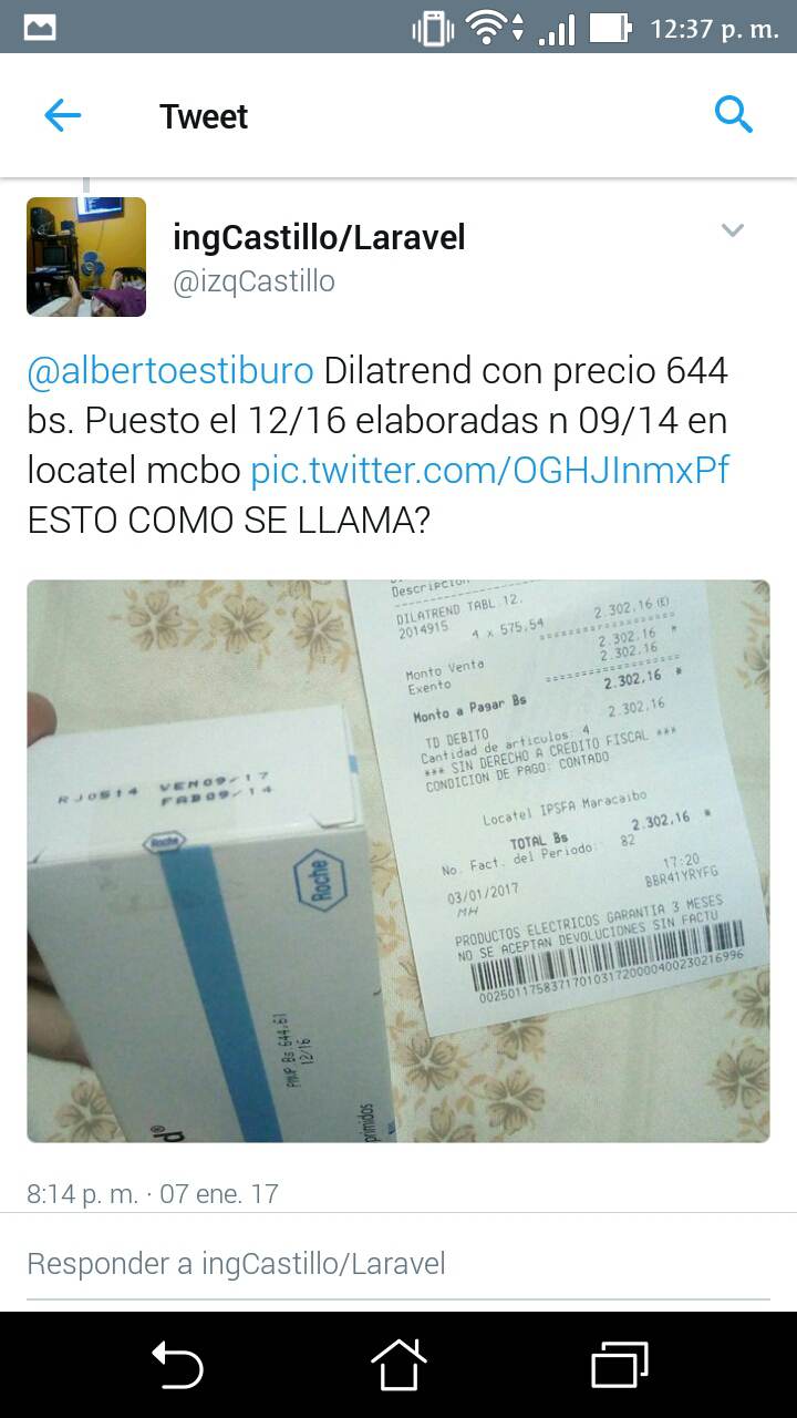 2 dias despues de comprar ese dilatren en una farmacia botiqueria de santa rita Maracaibo, el mismo elaborado en 2014 pero con el precio borrado como se ve en la imagen, me lo venden a 1195 bs. Casi el doble del comprado en Locatel.