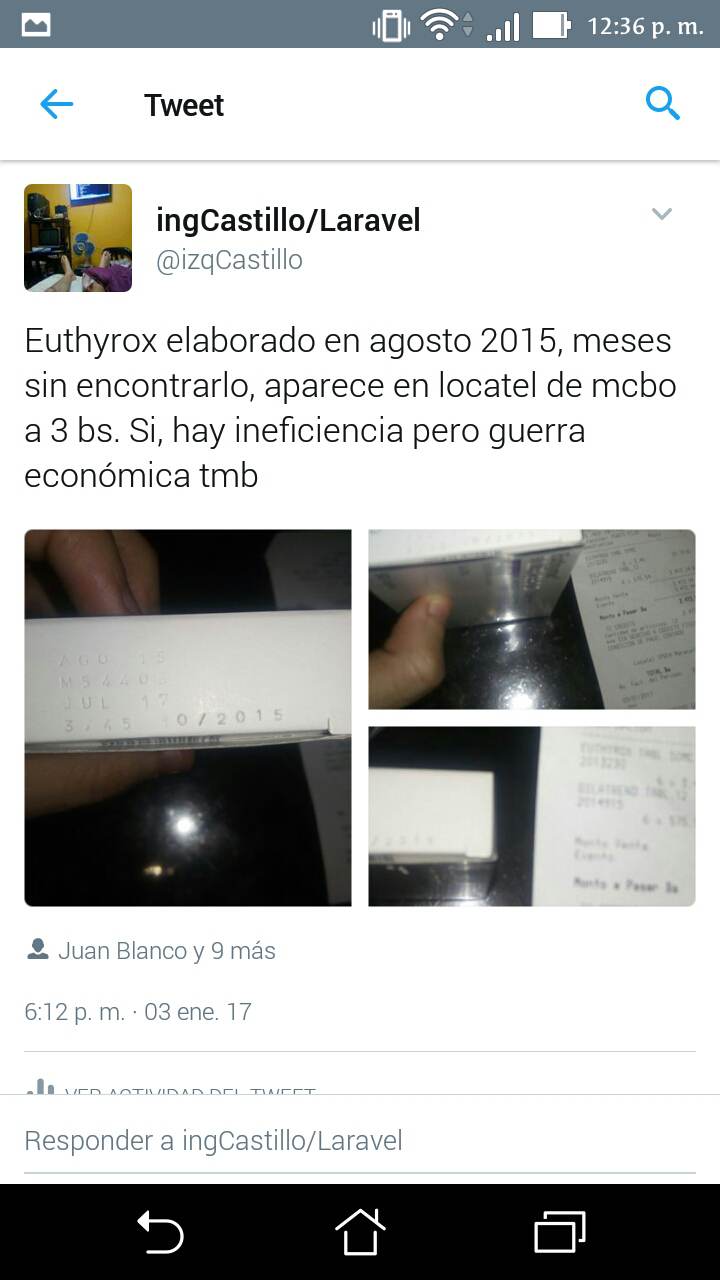 Este 2017 no fue la excepción, fui con mi familia, salimos a buscar un tratamiento para la bronquitis y otro para una crisis alérgica de mi bebe, ciertamente conseguir el antibiótico es una odisea desde que el estado permitió que esta crisis agarrara forma, pero pasando por establecimientos y como es nuestra costumbre, preguntamos por los medicamentos de diferentes abuelas en la familia, nos encontramos lo que ya hemos visto en los últimos a#os, varias farmacias están llenas de dilatrend, euthyrox, carvedilol, entre otros. Todos elaborados en el 2014 y 2015, con precios remarcados y en uno de los casos (euthyrox) con precio viejo de 3,45 bs. F. Al final del artículo verán las imágenes de las cajas de estos medicamentos y su factura respectiva, lo que sigue siendo prueba para muchos de nosotros que la crisis del país no es solo por ineficiencia del gobierno o que el presidente sea errático o tardío en toma de decisiones muchas veces, también es porque si hay una guerra económica silenciosa, un paro empresarial controlado por grupos y sectores que afectan directamente a la población con insumo muy sensible, pero además unos entes inoperantes o escasos de personal.