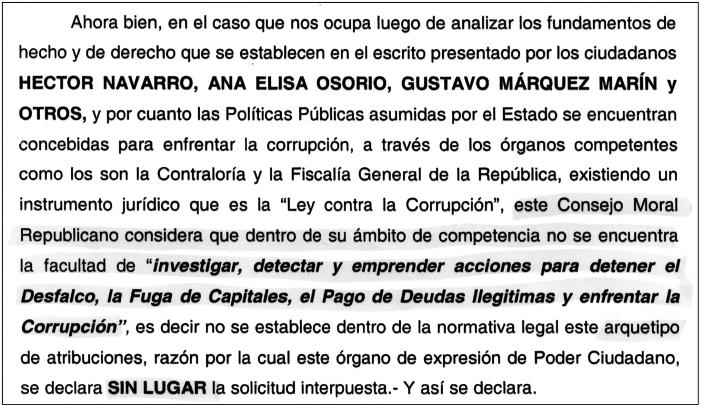 Es innegable que existe una relación directa entre la precarización de las condiciones de vida de la población y lo que ha sido el flagelo de la corrupción, que, como un velo destructivo ha ido progresiva y sistemáticamente minando las bases del Estado y de la sociedad venezolana. En este sentido quienes integramos la Plataforma Ciudadana por la Defensa de la Constitución, el 18 de septiembre del año 2015 (Ver en PDF), hicimos entrega formal a los representantes del Poder Ciudadano, concretamente al Dr. Tarek William Saab, quien para entonces ocupaba el cargo de Defensor del Pueblo y Presidente del Consejo Moral Republicano (CMR), un escrito donde explicábamos que acudíamos a esa instancia como figura que la conforman las instituciones del Poder Moral y, en virtud de que ya nos habíamos dirigido, sin respuesta oportuna y satisfactoria, en oportunidades anteriores tanto al Ministerio Público como a la Contraloría General de la República. Lo hacíamos en esa oportunidad para insistir en la denuncia que tiene que ver con la presunta desviación o pérdida de inmensas cantidades de recursos de la Renta Petrolera Nacional y de las divisas del país, recursos estos que hoy en día le están haciendo falta a nuestro pueblo, conducido a la peor crisis de carácter societal de toda la historia de Venezuela, comparable solamente con países que han estado sometidos durante años a situaciones de conmoción social extrema. No obstante, la respuesta a esa solicitud fue: